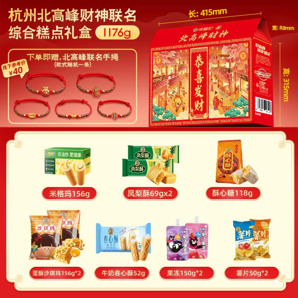 徐福记携手北高峰财神推出新年限定糕点礼盒,以“恭喜发财”为主题,融合传统年味与吉祥寓意,适合作为春节走亲访友的体面之选。礼盒内含多款经典徐福记点心,口感丰富、品质稳定,满足全家老少的零食需求。
