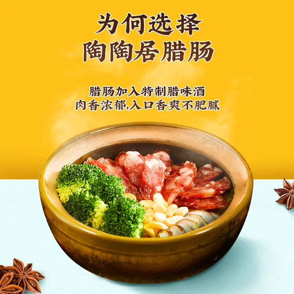 陶陶居这款心选腊肠,选用猪肉、白砂糖、大豆组织蛋白、食用盐等配料制成。肠衣轻薄,肉质紧实,口感咸甜脆爽。